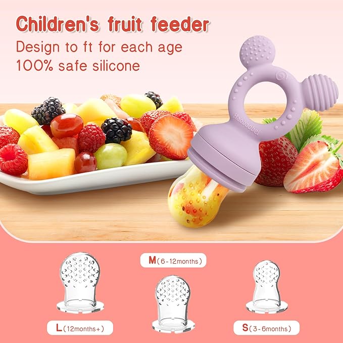 - [Premium Baby Fruit/Food Feeders & Teething Solutions] Crafted with a soft silicone pouch featuring tiny feeding holes, they promote self-feeding while ensuring only manageable, digestible pieces are consumed. With a seamless one-piece silicone handle design, choking hazards are eliminated, providing a worry-free feeding experience.