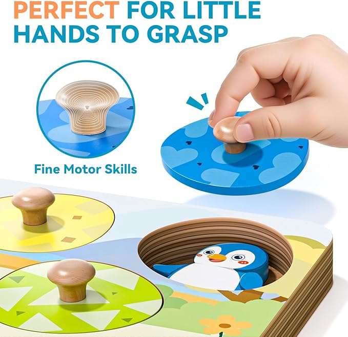 - Durable Design and Safety: Crafted from wood and coated with water-based paint, our Montessori puzzle toy is built to last. The smooth edges and vibrant colors ensure a safe and enjoyable play experience. Upgraded knobs design makes our toy to better protect children during play.