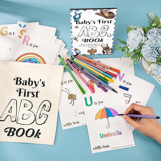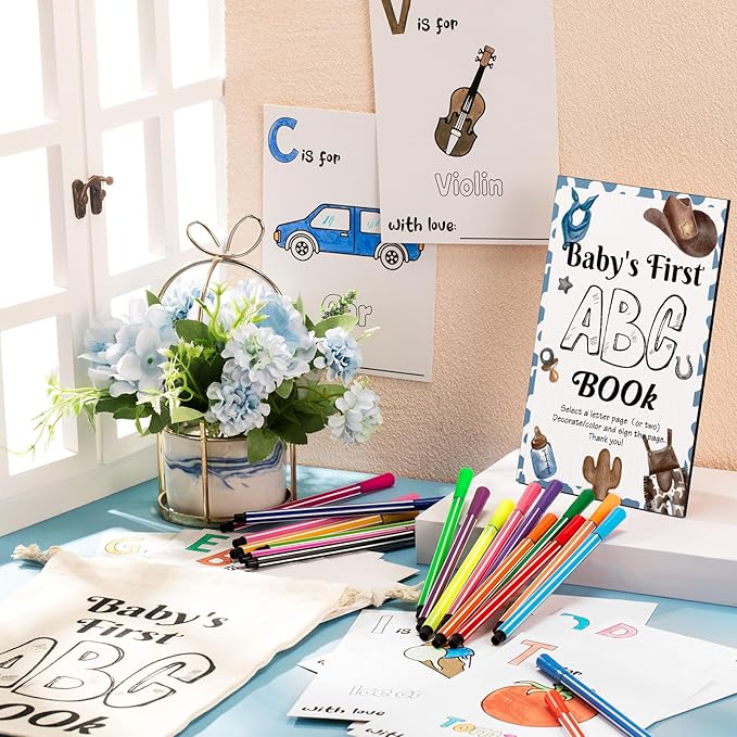 Geelin 51 Pcs Fun Baby Shower Game Activities First Abc Book Sign Coloring Game Card 26 Alphabet a to Z Coloring Card with 24 Watercolor Pen Storage Bag for Baby Shower Party(Cowboy)
