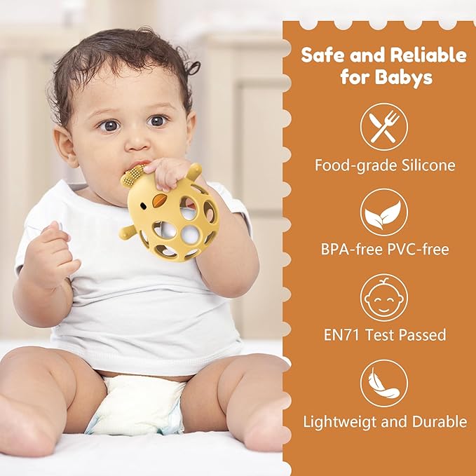 - 【Safe & Sound Silicone】This soft teething toy set includes an easy-to-grasp teether and a rattle ball. This baby teether is made from 100% food-grade silicone, BPA-free, phthalate-free, and worry-free.