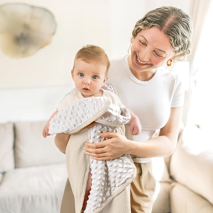 - Lightweight Dual-Fabric Design: Muslin & Minky Dot - Features a breathable muslin front and a warm minky fleece back. The lightweight, double-layer construction balances airflow and thermal retention, ideal for naps or daily cuddling