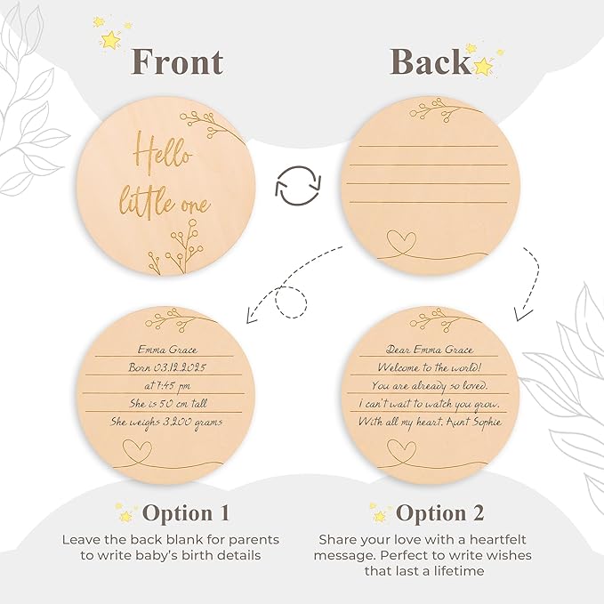 - Fun and Thoughtful Design: Wooden ''Hello Little One'' newborn sign for baby girl & boy, this double-sided wooden birth announcement sign with fun quote on one side to stylishly celebrate your baby's arrival, the other side offers enough space to record baby's birth details or write a heartfelt message. Ideal for gender reveal gifts, this baby announcement sign also makes a unique addition to any mommy-to-be gift basket or expecting parents’ gift