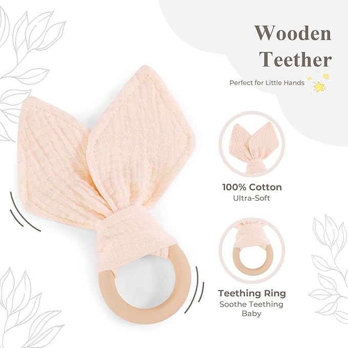 - Baby Essentials for Newborn Boys or Girls: The baby gift set includes gender-neutral essentials such as a cozy muslin lovey comforter, baby bandana bib, and a wooden teething ring with soft bunny ears, perfect for little hands.These practical items are perfect for a baby boy gift basket or baby girl gift set, making it an excellent choice for newborn gifts or postpartum gifts for moms