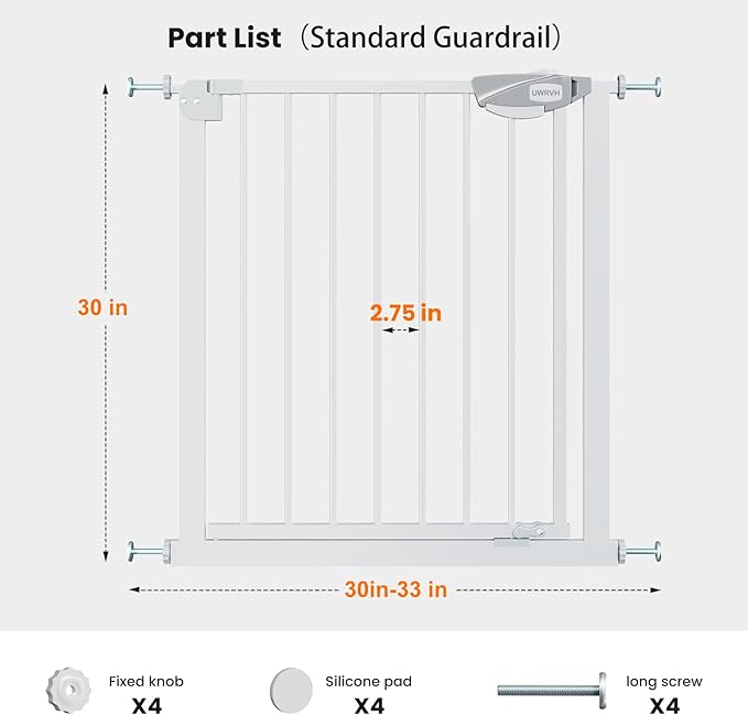 - Suitable for multiple scenarios: kitchen, staircase, room, etc. This walk-through baby gate adjusts to fit doorways from 29β to 33β wide and stands 30β high.