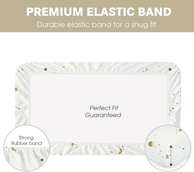 - Perfectly Fit: Measuring 52” x 28”, our fitted crib sheets are designed for all standard crib and toddler mattresses. With 8” deep pockets and 360° elastic all around, the sheets stay snug and secure, ensuring a safe and smooth sleep surface for your baby.