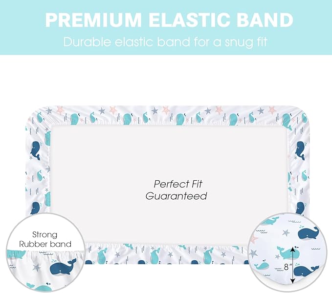 - Perfectly Fit: Measuring 52” x 28”, our fitted crib sheets are designed for all standard crib and toddler mattresses. With 8” deep pockets and 360° elastic all around, the sheets stay snug and secure, ensuring a safe and smooth sleep surface for your baby.