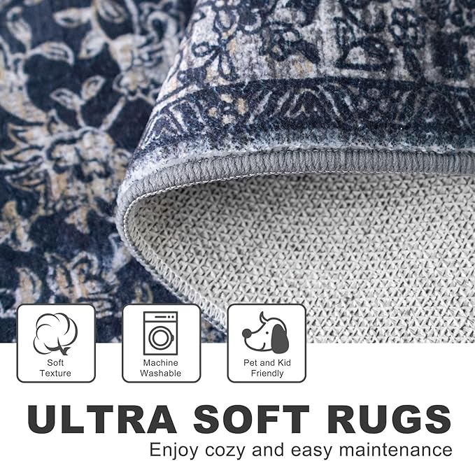 KILOCOCO Runner for Hallway 3x14 Runner Rug Printed Vintage Floral Washable Rug Kitchen Runners Soft Non-Slip Low Pile Hallway Runners Laundry Room Distressed Boho Rugs, Navy/Charcoal