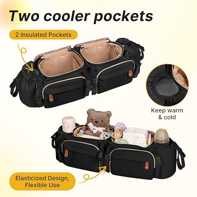 - 【Large-Capacity Storage】This double Stroller Caddy Organizers with Cup Holder features 6 thoughtfully designed main storage sections that contain a total of 14 functional pockets, including 2 front pockets for wipes and tissues and 2 rear mesh pouches for additional storage.Sized at 24.4 x 5.5 x 6.3 inches, it fits baby essentials like diapers, bottles, toys, and snacks, as well as personal items like keys, phones, and sunglasses for easy access on the go