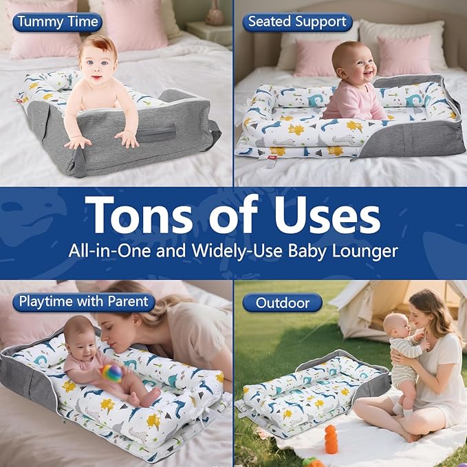 - Safe & Snug Baby Lounger for 0-24 Months: Our infant lounger features breathable pure cotton with adorable prints (Crown/Dinosaur/Cloud/Car) and 3D polyester as the filling's materia. It keeps baby cool during summer & snug in winter – all while supporting healthy hip development.