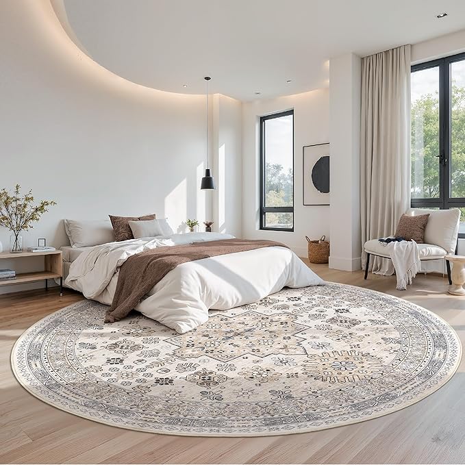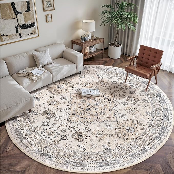 zesthome 9ft Round Rugs for Living Room, Non-Slip Washable Round Area Rugs, Ultra-Thin Large Circle Rugs, Soft Low Pile Rug for Bedroom, Kitchen - Vintage Stain Resistant Round Rug (Beige,9'x9')