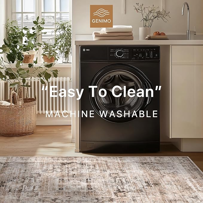 GENIMO 8x10 Area Rugs for Living Room, Machine Washable Non Slip Vintage Rugs, Low Pile Lightweight Chenille Print Rug for Bedroom, Dining Room, Home Office, Brownish Drab