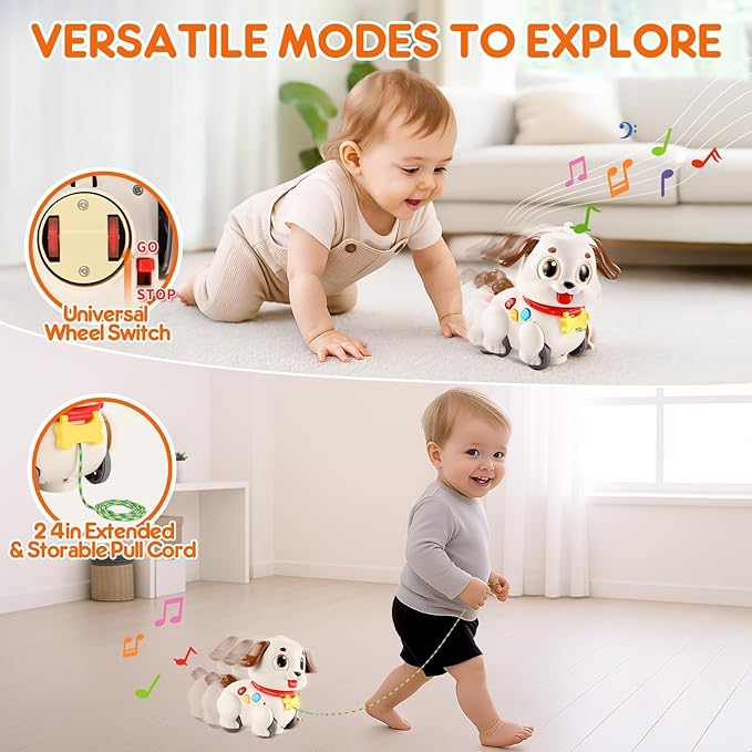 - VERSATILE MODES TO EXPLORE: Adorable baby musical toys for 1 2 3 year old boy girl, GO Mode puppy toys for ages 0-2 will move on it's own, realistic shaking head, blinking eyes, swing ears and walking legs, engaging baby tummy time crawling toys. Switch 1 2 3 year old boy girl toys to STOP Mode, happily sit to play or walk with interactive push pull toys for toddlers 1-3