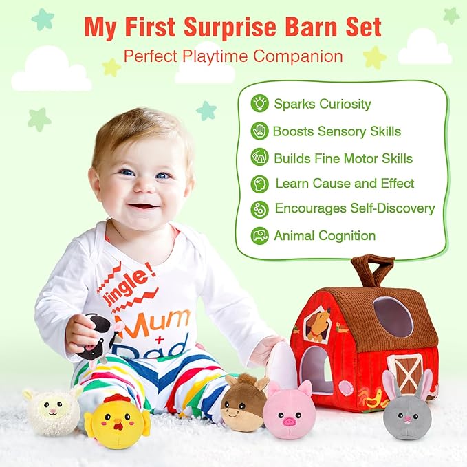 - MONTESSORI-INSPIRED BABY FARM TOYS: This soft plush barn toy features 6 sensory-rich stuffed animals and cleverly designed openings for little hands to explore. Each animal hides unique textures and sounds, sparking babies' curiosity. Through fun "in-and-out" play, babies develop object permanence, fine motor skills, and early problem-solving abilities. It also encourages pretend play and animal recognition, providing hours of joyful learning for your baby.