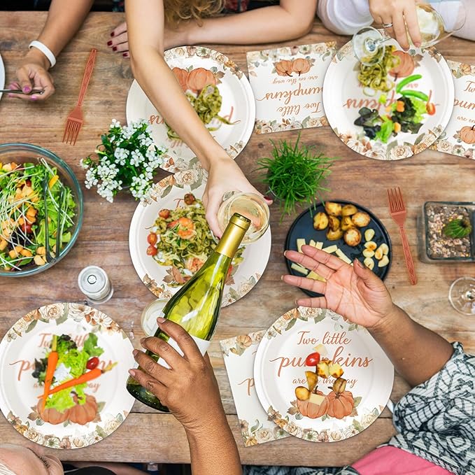 - Two Little Cuties Party Tableware Set: the package comes with an extensive set of tableware that caters to all your party needs; It includes 24 pieces of 9 inch paper plates, 24 pieces of 7 inch paper plates, 24 pieces of paper napkins, and 24 pieces of Pumpkin plastic forks; Ensures 24 guests at the party is served well