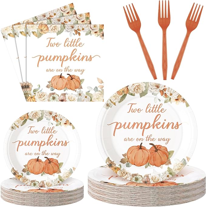 - Charming Design for Twins Celebrations: these Pumpkin two little cuties tableware sets are designed with small Pumpkin, flowers, leaves and features a charming 'two little cuties are on the way' theme, eye catching and charming, leaving your guests a deep impression