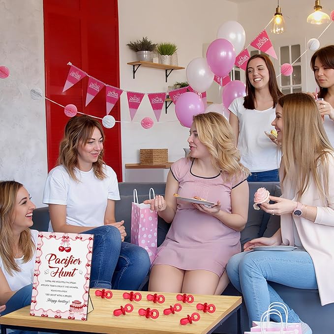 Thyle 51 Pcs Pacifier Hunt Baby Shower Games Include Hunt Sign and 50 Acrylic Pacifiers for Baby Shower Game Decoration Gift Sets Gender Reveal Party Decor (Cherry)