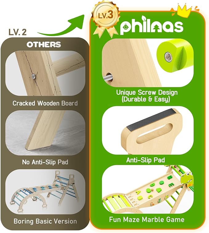 - Perfect Present & Trusted Support: Give a gift that grows with them! This wooden climbing set for toddlers is perfect for kids ages 2-5/3-6, great for birthdays or holidays. Backed by Philnas after-sales support you can trust—reach out to us anytime