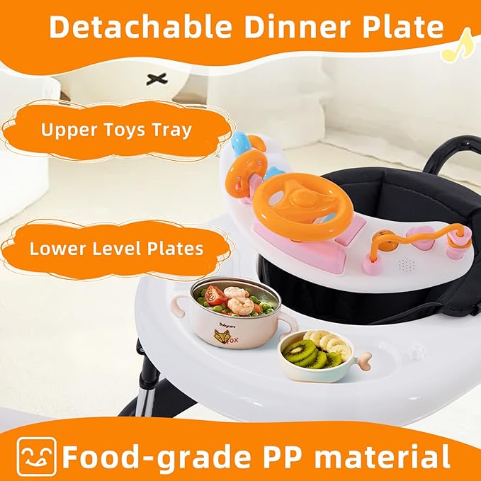 - [Music Box & 4-in-1 Baby Walker] Our baby walker features a detachable music box tray with 5 gentle songs, 4 piano key sounds, flashing lights, and playful toys like a windmill and steering wheel to spark your baby’s curiosity. It not only makes walking practice fun but also supports early learning and sensory development. This walker easily transforms into 4 modes—Walker Mode, Play Mode, Eating Mode, and Push Mode—meeting the needs of baby at every stage from 6 months to 18 months.Note: Music tray Requires 2 AA batteries (not included)