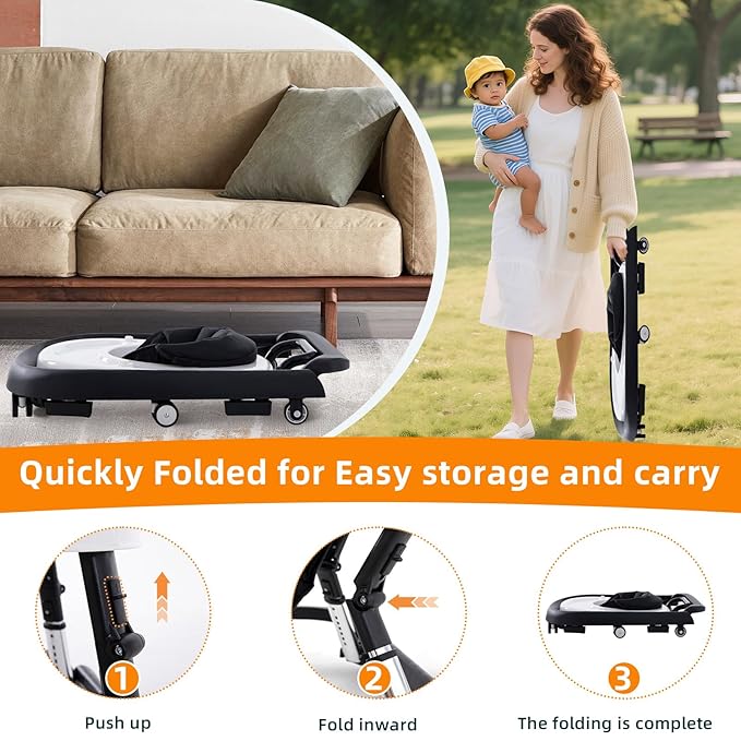 Baby Walker Foldable with Music and Lights,Portable Baby Walker with Wheels,9 Adjustable Heights,Removable Tray&Footrest, Speed Adjustable,Infant Toddler Walker for Baby Boy Girls 6-18 Months (Black)