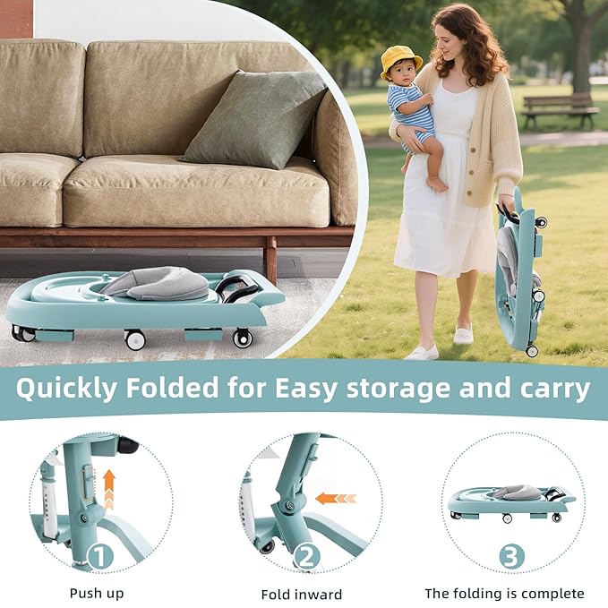 Baby Walker Foldable with Music and Lights,Portable Baby Walker with Wheels,9 Adjustable Heights,Removable Tray&Footrest, Speed Adjustable,Infant Toddler Walker for Baby Boy Girls 6-18 Months(Green)