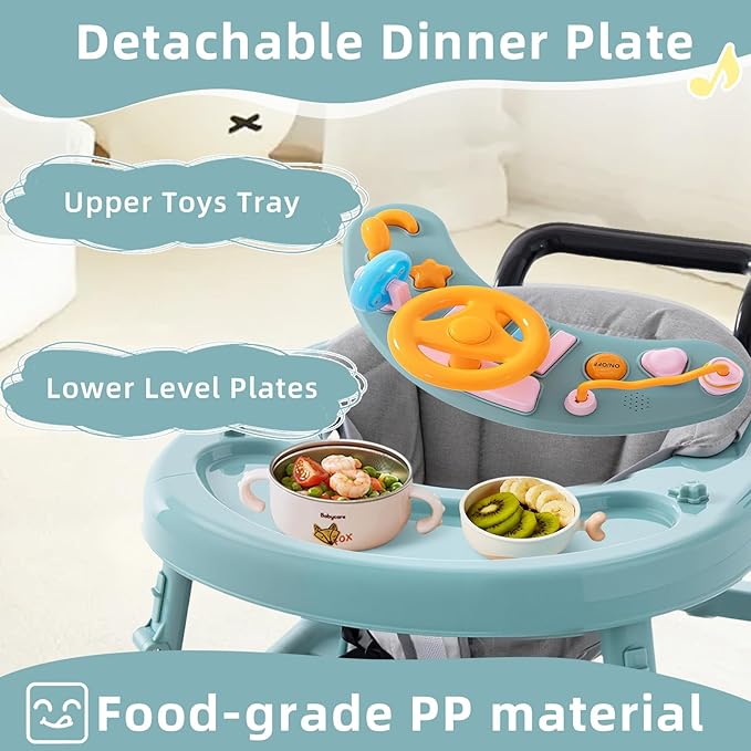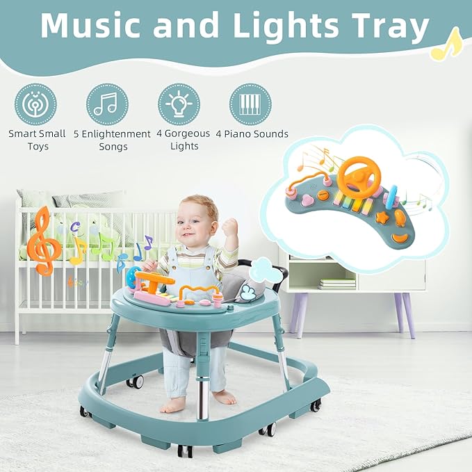 - [Music Box & 4-in-1 Baby Walker] Our baby walker features a detachable music box tray with 5 gentle songs, 4 piano key sounds, flashing lights, and playful toys like a windmill and steering wheel to spark your baby’s curiosity. It not only makes walking practice fun but also supports early learning and sensory development. This walker easily transforms into 4 modes—Walker Mode, Play Mode, Eating Mode, and Push Mode—meeting the needs of baby at every stage from 6 months to 18 months