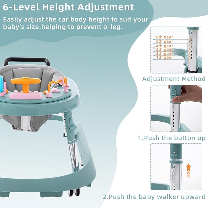 - [10-Level Adjustable Height & Comfy Seat] The baby walkers for boys and girls have 10 10 gear adjustment modes (6 body levels + 4 gear seat levels), you can easily find the right fit with just one button.(Adjustable body height: 15.75 inch to 18.5inch) The soft, adjustable seat cushion provides extra support and a gentle tilt, while the breathable fabric keeps your baby comfortable during playtime.Perfect for everyday use as your little one learns to walk