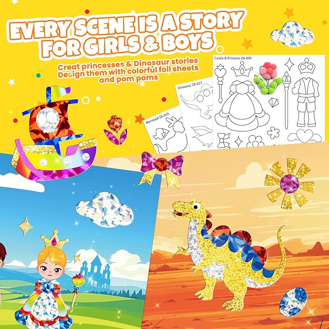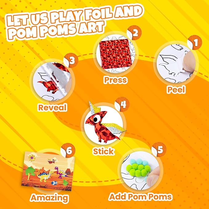- Foil Art & Craft Activity Include: Our foil and pom poms art fun package includes 10 picture canvases, 10 sheets foam stickers, 100 colorful foil sheets, 600 pom poms, 600 double-sided adhesive dots, and 1 set of detailed operating instructions, providing plenty of mess-free foil and pom poms art and craft activities for kids ages 4 5 6 7 8 9 10 11 12 to fully unleash their imaginations