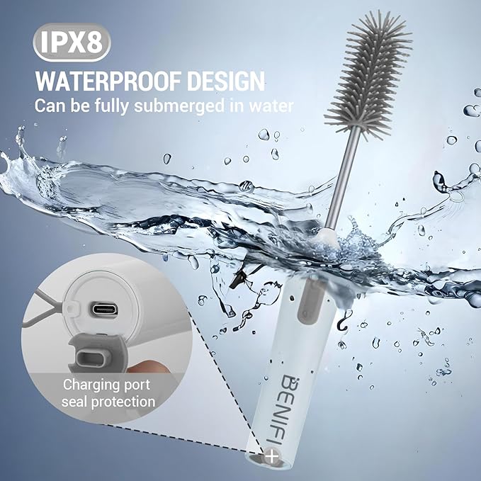 Travelling Electric Bottle Brush Set, Baby Bottle Brush Set, Long Handle Bottle Brush, BPA Free Silicon Bottle Brush, Storage Stand, Milk Mixer, Egg Whisk Included (Gray, Normal)