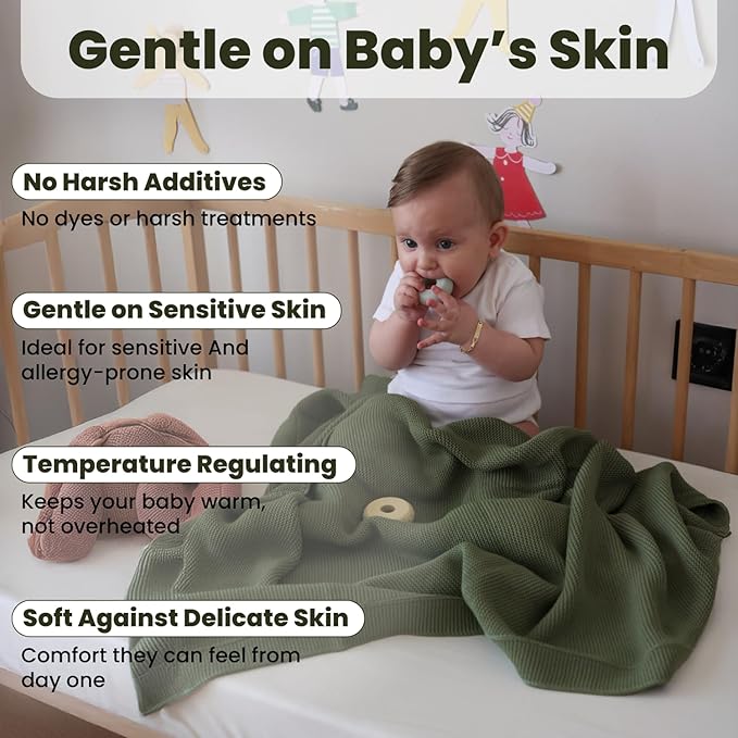 100% Organic Cotton Baby Knitted Blanket with Gift Box - Soft Toddler, Crib, Stroller Blanket - Neutral Swaddle and Receiving Blanket for Newborns, 30"x40", Pepper Green