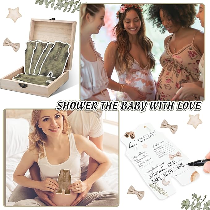 50 Pcs Double Side Green Cloth Baby Predictions & Advice Neutral Boy Cards for New Parents Baby Shower Games with Cards Wooden Keepsake Box for Wishes Decorations