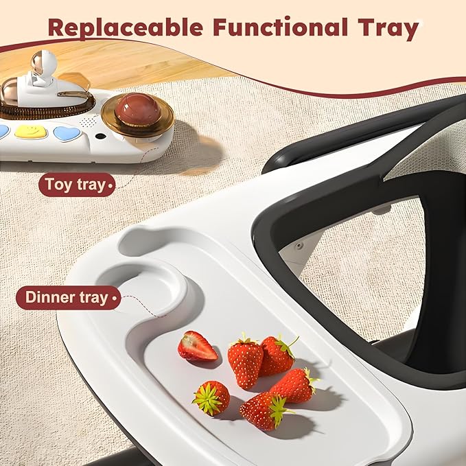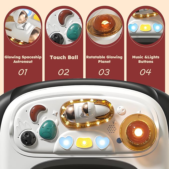 - 【Music toy light show】The baby walker has two functional plates: a music light show and a replaceable dinner plate. The music plate is a space planet theme game plate that provides a variety of music and light flashing effects, and there are astronauts, spaceships, planets, moons and other modeling accessories. Walkers for babies help early baby sensory development, stimulate curiosity, exercise the baby's limb coordination ability, and encourage exploration and learning to walk. Note: 2 AA batteries are required (not included)
