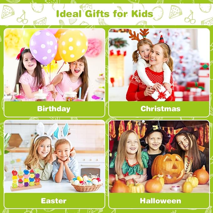 - 🥝 Brain-Boosting Pattern Play: Spark critical thinking! Kids select a challenge card, sequence beads on the wooden stand, and recreate patterns—enhancing logic and observation skills. Adjustable difficulty grows with your child (18 months to 5 years). Doubles as matching games for toddlers 2-4 or fine motor skills toys for 1-2 year olds. Montessori toys for 2 year old. The set includes 10 different kinds of fruits, such as watermelon, orange, lemon, etc. Sensory toys for toddlers 1-3.