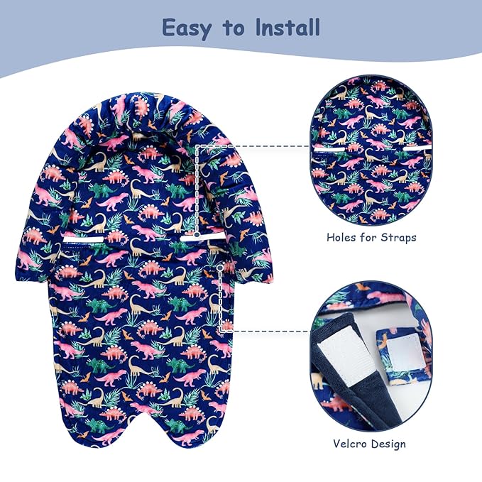 SWESEN Baby Car Seat Head Support, Super Soft 2 in 1 Infant Car Seat Insert, Reversible Newborn Car Seat Insert Cushion with Strap Covers for Strollers, Bouncers, Swing, Navy Dinosaur