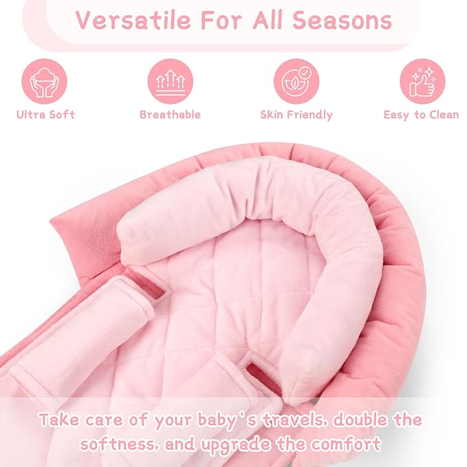 Baby Car Seat Head Body Support & Strap Covers, 2 in 1 Infant Car Seat Insert, Reversible Soft Breathable Newborn Cushion Pads for Preemie, Perfect for Baby Carseats, Strollers, Swings (Pink)
