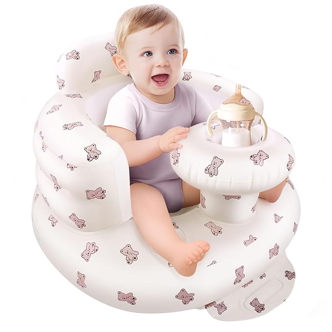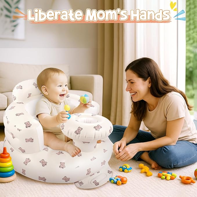 Arscniek Inflatable Baby Seat Built in Air Pump, Blow Up Baby Chair with Back Support and Tray, Sit Me Up Floor Seat for Babies 3-36 Months, Portable Infant Chairs for Indoor and Outdoor- Biscuit Bear