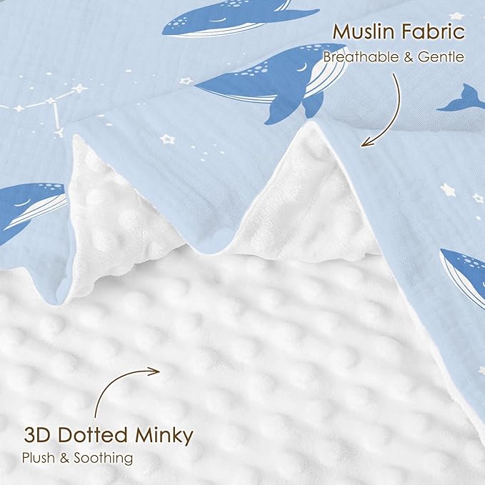 Whale Baby Blankets for Boys Girls, Soft Nursery Minky Blankets with Muslin and Dotted Fleece Back 30x40 inches, Receiving Bed Quilt for Newborn, Infants, Toddlers
