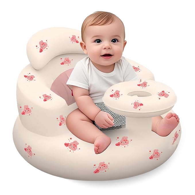 Inflatable Baby Seat with Tray, Blow up Infant Chair for Babies 3 Months and up, Comfortable Baby Floor Seats for Sitting Up, Built in Air Pump with Back Support Toddler Waterproof Sofa (Pink Rabbit)
