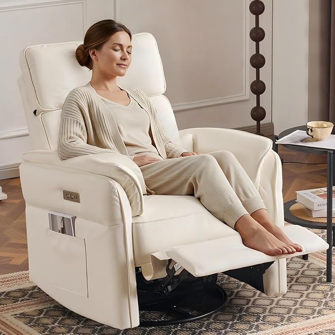 - [Swivel and Rocking Motion]The power glider swivel rocker recliner chair is designed with Mom's comfort in mind, featuring a 270-degree swivel and 90-145Β° recliner angle, silent gliding mechanism with one-touch operation, offers flexibility and versatility for maximum comfort, plus includes an extended footrest for complete relaxation, making it perfect for activities such as watching television, sleeping, and reading.