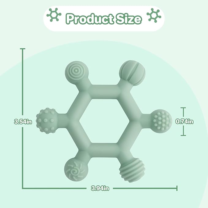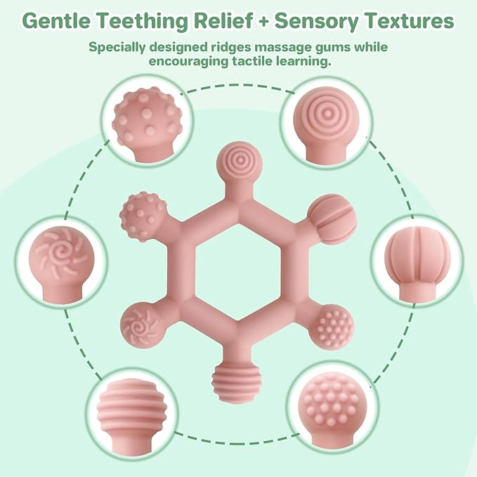- 1.Unique Hexagonal Massage Design & Diverse Textures: The hexagonal body features six outward-projecting soft nubs. Each nub is meticulously designed with a distinct textured surface (e.g., waves, dots, stripes). This varied tactile design comprehensively stimulates different areas of baby's gums, providing more effective soothing massage.