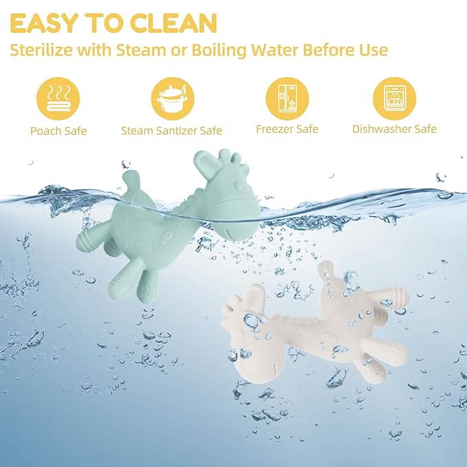 - Easy to Clean and Freezable: Dishwasher safe (top rack) , freezer safe and steam santizer safe. Clean the cute giraffe teething relief toys before using. Hand wash with mild soap and water or toss in the dishwasher for hassle-free sanitizing. Enhance the soothing experience by cooling the teether in the freezer for a refreshing and calming effect on sore gums. They're also waterproof and can be used as bath toys. There’s no holes on them so mold isn’t able to grow after washing, and there’s no small parts or pieces that can pose as a choking risk