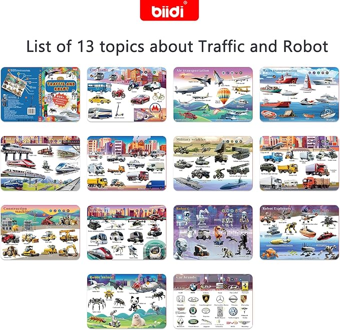 - Rich Content & Highly Entertaining English Talking Book: This activity sound book contains 600+ sounds, such as words, phrases,Interactive games ,songs, stories, etc. Moreover, this interactive audio book has 13 theme about "Traffic and Robot", such as air transportation,Water transportation,Rail transportation,Robot animal,etc.