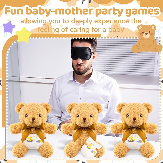 - Product Include:You will receive 4 stuffed bears, 4 black eye masks, 4 mesh bags, and 4 teddy bear diapers, enough for you to assemble into a baby party game set, suitable for playing baby party games with your friends