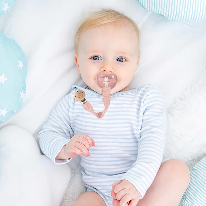 - Upgraded Wooden Stainless Steel Clips: The clip head has three holes to avoid choking, making it safer for babies; The metal clasp on the pacifier clip is strong and secure, we upgraded it with stainless steel material, no rust after use. The metal clip that attaches to clothing has a wooden cover to protect the skin from becoming scratched.