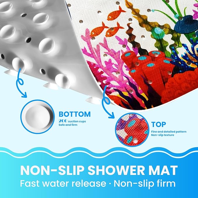 - ULTRA-SECURE NON-SLIP GRIP: Featuring 200 strong suction cups, this bathmat stays firmly attached to smooth tub or tile surfaces. The soft, textured surface ensures a comfortable and slip-free experience, perfect for toddlers and seniors alike.