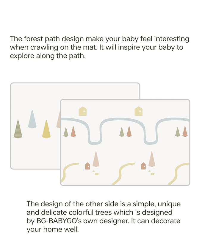 - [Cute Double Cartoon Design]: BG-BABYGO baby play mat matches different home décor perfectly with reversible design. One side has funny track pattern design to let your child use their imagination to play car games, while the other side features a simple row of colorful trees design to decorate your home perfectly.