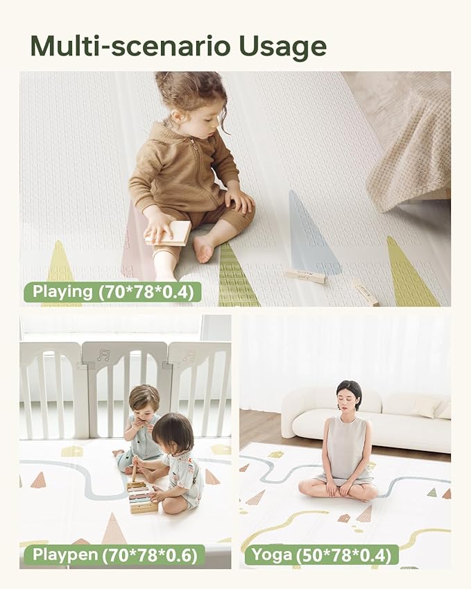- [Multi-specification & Large Size]: Our baby mat for floor desighed in multiple sizes. The 50"*78" & 70"*78" provide enough space for your little one to explore, play, and take a nap. We are the only brand that provides with 0.4" and 0.6" thickness playmats on Amazon, more specifications for you to choose.