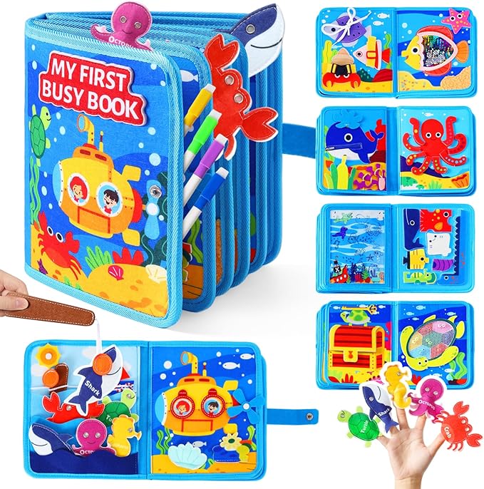 - My First Busy Book: 16-in-1 Montessori sea animals activity book. Dive into Montessori-inspired world of learning with our 10-page busy board featuring 16 hands-on activities. Featuring a variety of mechanisms to enhance motor skills, hand-eye coordination, cognitive skills, concentration & patience, imagination, muscle development, self-care skills, and foster a proactive spirit of learning and exploration, nurturing independent & confident characters