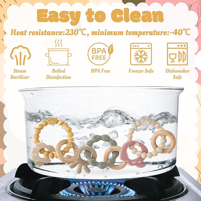 - EASY CLEANING: Before using the toddler teething toys for your baby, it is recommended to disinfect it in boiling water for 2-3 minutes. In addition, the toddler teething toys can be disinfected in boiling water, autoclave, or refrigerated, with temperature resistance ranging from -40°C to 230°C. After use, you can simply place it in the dishwasher or wipe it with warm soapy water for easy cleaning!