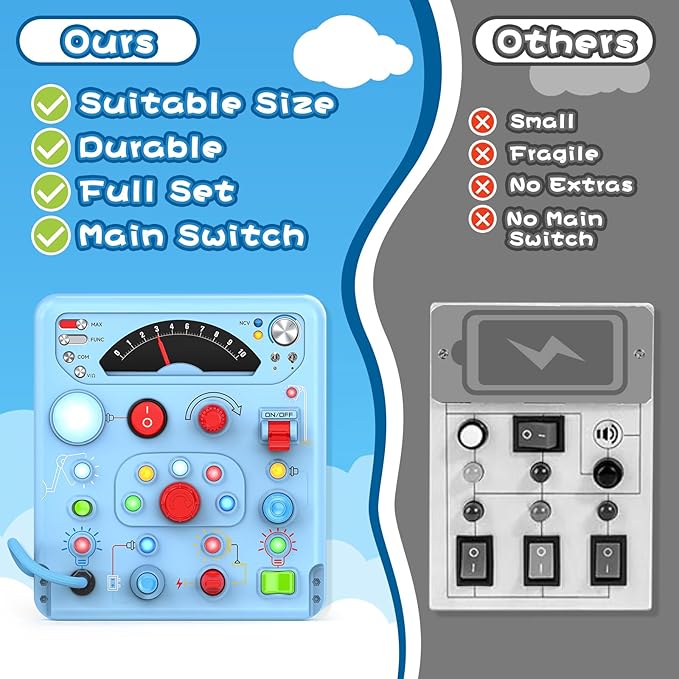 - Develops Fine Motor Skills: This toddler busy board helps kids stay focused while controlling different LED light switches and rotating a pointer. It promotes hand-eye coordination, interactive skills, and electrical safety awareness through play, encouraging active exploration and sparking curiosity about the world