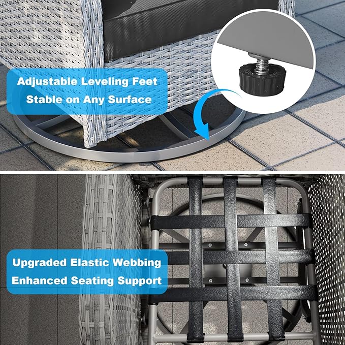 - Adjustable Leveling Feet:No more wobbling! Equipped with adjustable leveling feet on each base, these outdoor swivel chairs stay balanced even on uneven floors like tiles or wood decking. The sturdy circular base also provides enhanced stability during rocking and spinning.